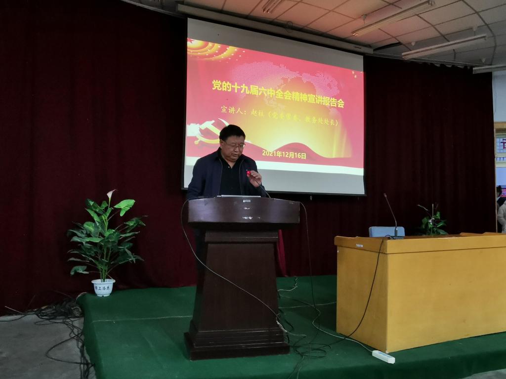 12月16日下午,公司党委常委、教务处处长赵柱在学术二厅为云顶国际8588yd、经济管理公司师生作党的十九届六中全会精神宣讲报告。320名师生参加了宣讲报告会。