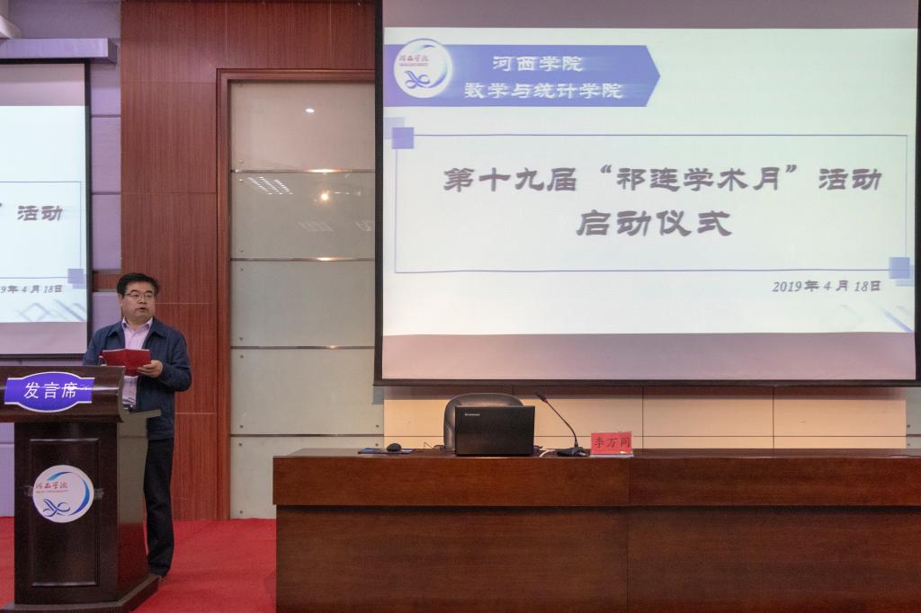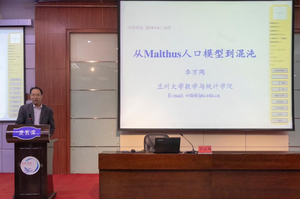 4月18日下午,公司举办第十九届“祁连学术月” 活动启动仪式暨校外专家学术报告会在公司图书馆二楼报告厅举行。兰州大学博士生导师李万同教授为全院师生作了题为“从Malthus人口模型到混沌”的学术报告。启动仪式暨报告会由公司李拓教授主持,云顶国际8588yd100多名师生聆听了报告。