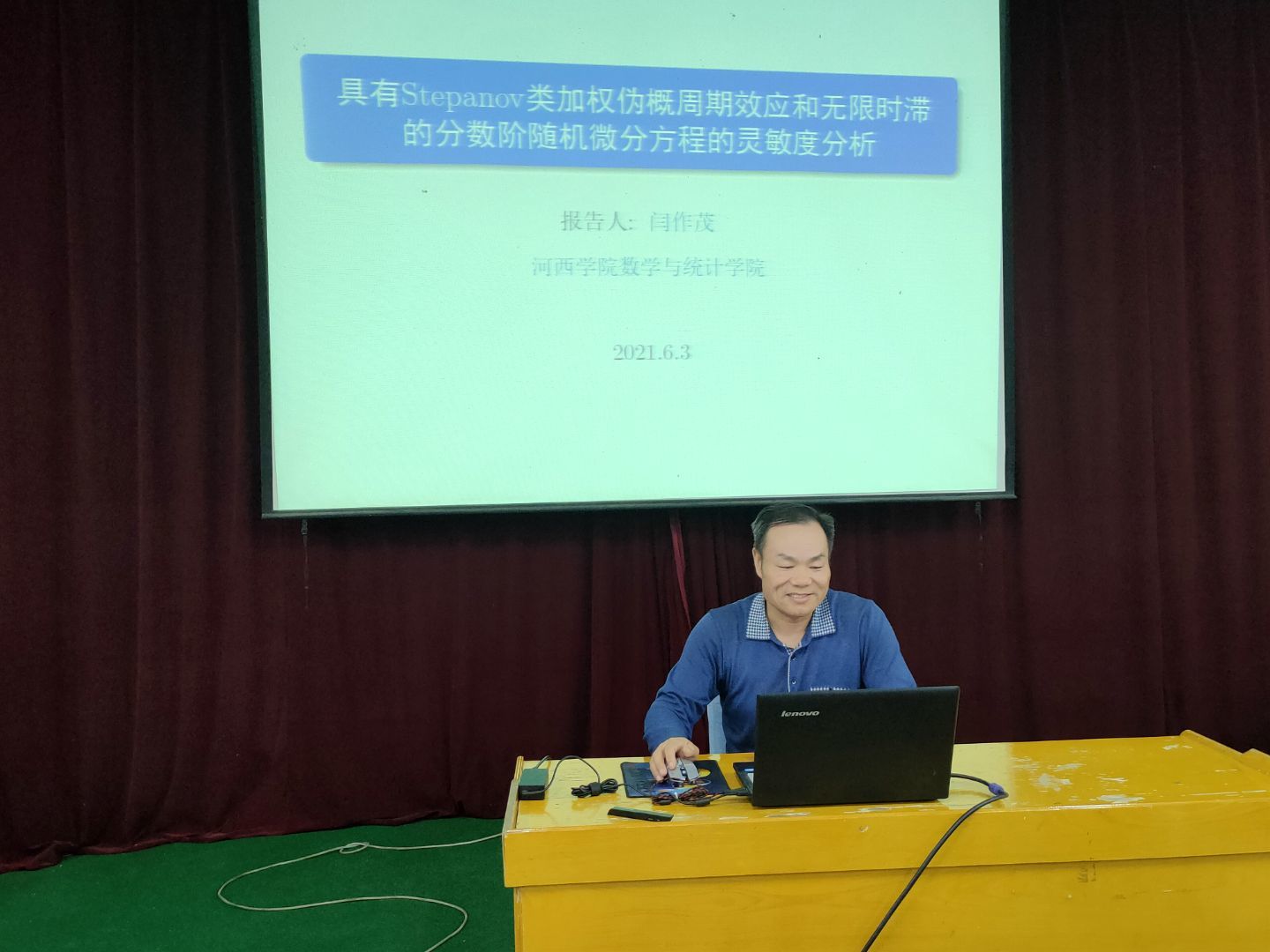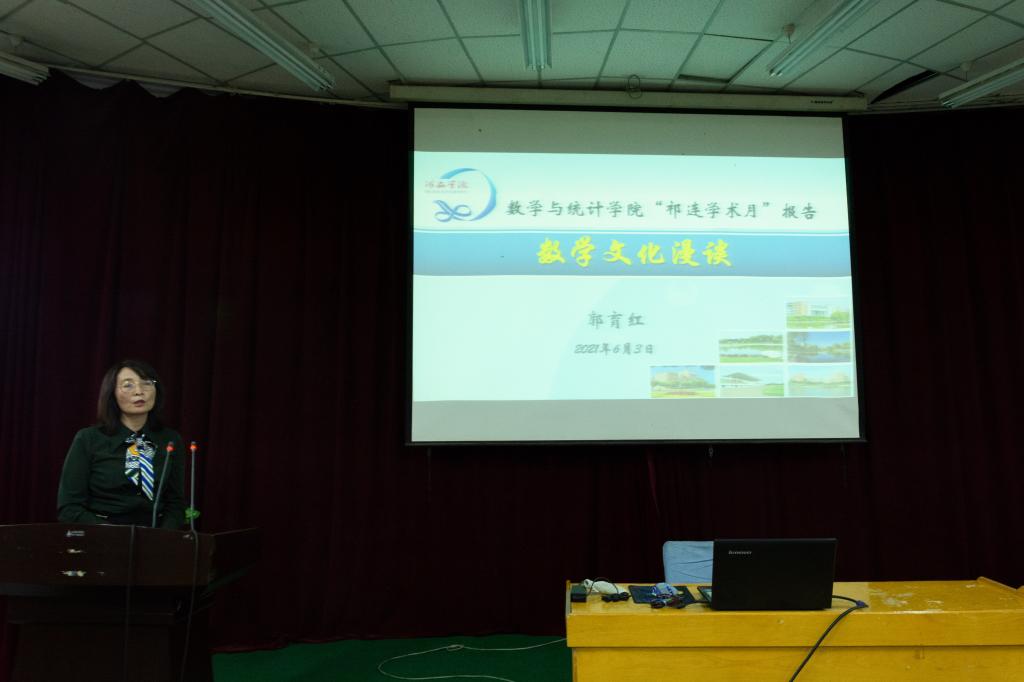 报告会上,郭教授以“数学文化漫谈”为题,紧紧围绕三大数学危机、哥德巴赫猜想、费马大定理、哥尼斯堡七桥问题、勾股定理和分形等方面介绍了数学文化的相关知识及以数学文化为切入点的课程思政建设做法。闫教授以“具有stepanov类加权伪概周期效应和无限时滞的分数阶脉冲随机微分方程的参数敏感度分析”为题,报告了Hilbert空间中具有Stepanov类加权伪概周期效应和无限时滞的分数阶脉冲随机微分方程的参数敏感度分析问题。