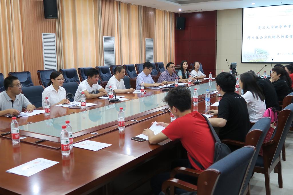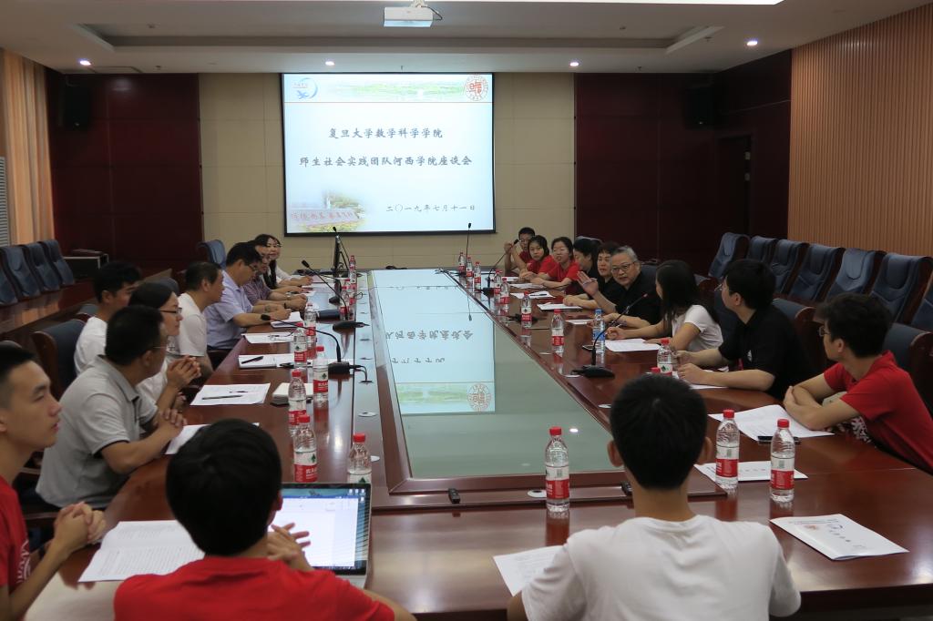 2019年7月11日上午,复旦大学数学科学学院师生“数肃情”社会实践团队与公司师生在河西讲堂三号会议室开展座谈交流。参加本次会议的嘉宾有:复旦大学数学科学公司党委书记王永珍、周春莲副教授、王云助理研究员、蔡颖颖老师、社会实践团队组长王周军老师及员工9名。云顶国际8588yd数学与统计公司党委书记李拓、美术公司副经理陈文福、文公司哈建军教授、王锐教授、韩杰副教授、历史文化与旅游公司安玉军副教授、信息技术与传媒公司祁昌平副教授、体育公司刘茂昌副教授、马克思主义公司郭梅副教授、音乐公司教师全先锋老师等。云顶国际8588yd科技处副处长杜军林主持本次座谈会。