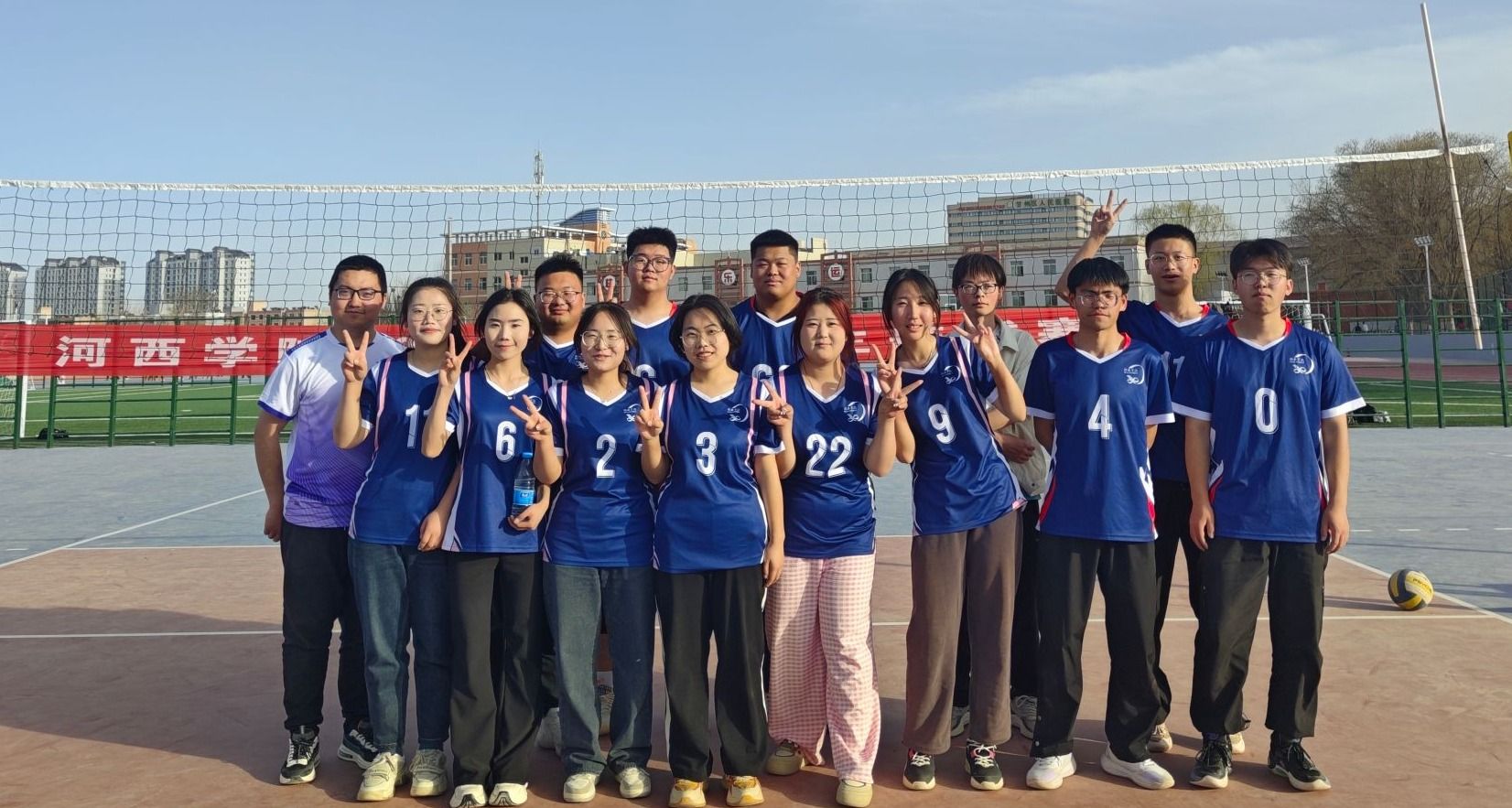 赛期恰逢风沙天气,公司运动员无惧挑战。女排姑娘们发球准、防守稳,一路赢了文公司、马克思主义公司等队伍,最后拿到亚军;男排小伙们也顽强拼搏,拿下第五名。赛场上,队员们专注比赛,场边师生自发组建后勤队,组成"最强后援团",为运动员递水、呐喊助威,成为一道独特风景线。